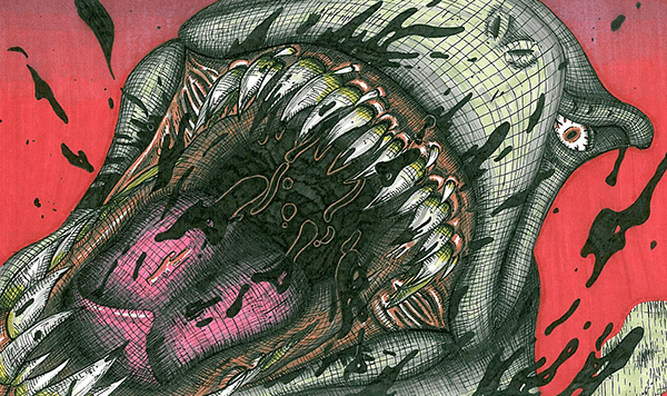 My goal was to create a piece that incorporates the numerous pen techniques I have learned. I used this opportunity to experiment with contour lines and line weights. Without using color, I challenged myself to create a sense of dimension, distance, and exaggerated perspective. Inspiration was drawn from observing bones, studying the techniques utilized by Virgil Finlay, and the Magic The Gathering card game. The illustration provides much to look at considering the intricacies of the ribs, clouds, and lightning.