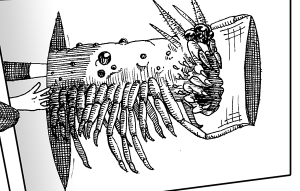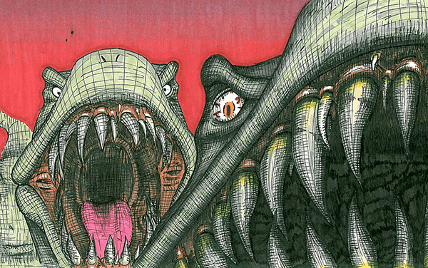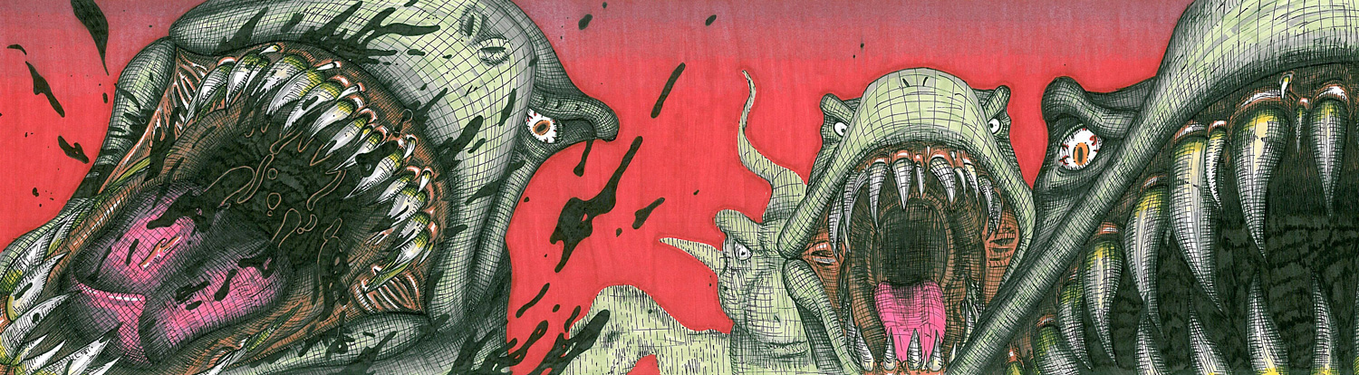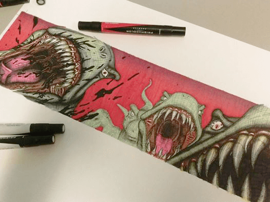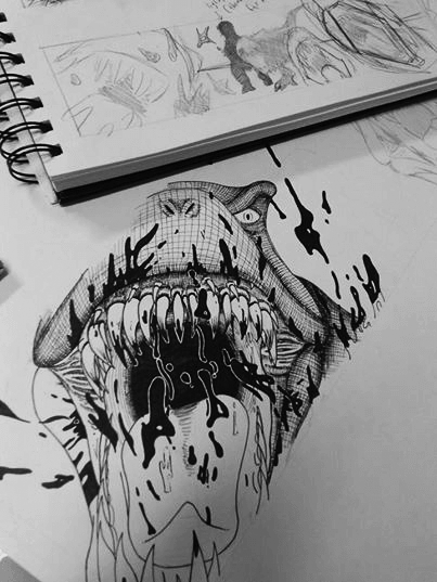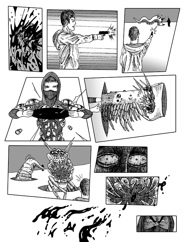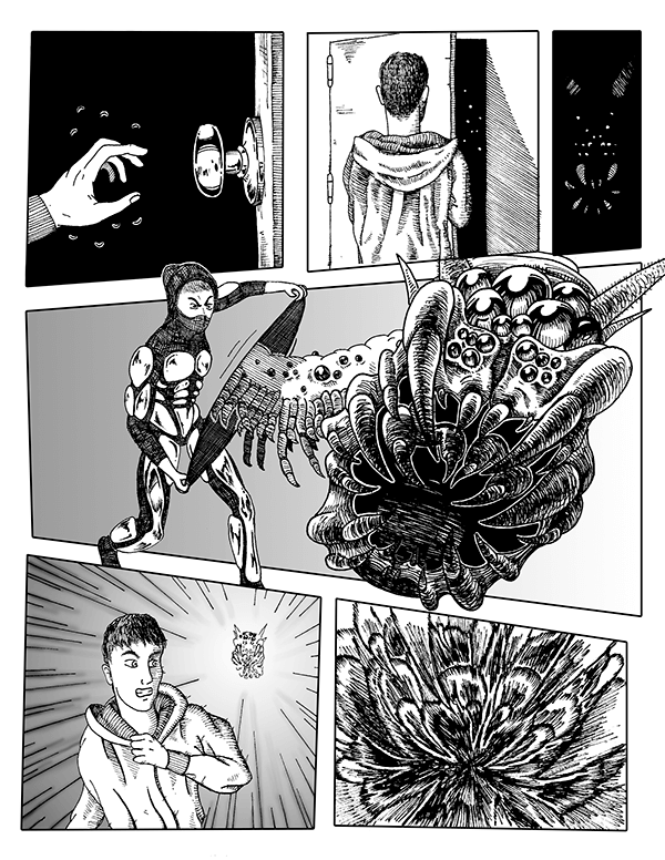 One can see how I am developing my illustrative style through utilizing crosshatching and contour lines. I challenged myself to refrain from crosshatching in every area. Depending on the surface texture, I would sometimes use cross contour lines that are applied in one direction (hence the monster's fangs). I am also pushing myself to improve my eye for composition. The comic was conjured up in my imagination and features me being chased by a monster. With intricate pen techniques and simple gradients, the illustration exhibits a graphic yet complex feel.